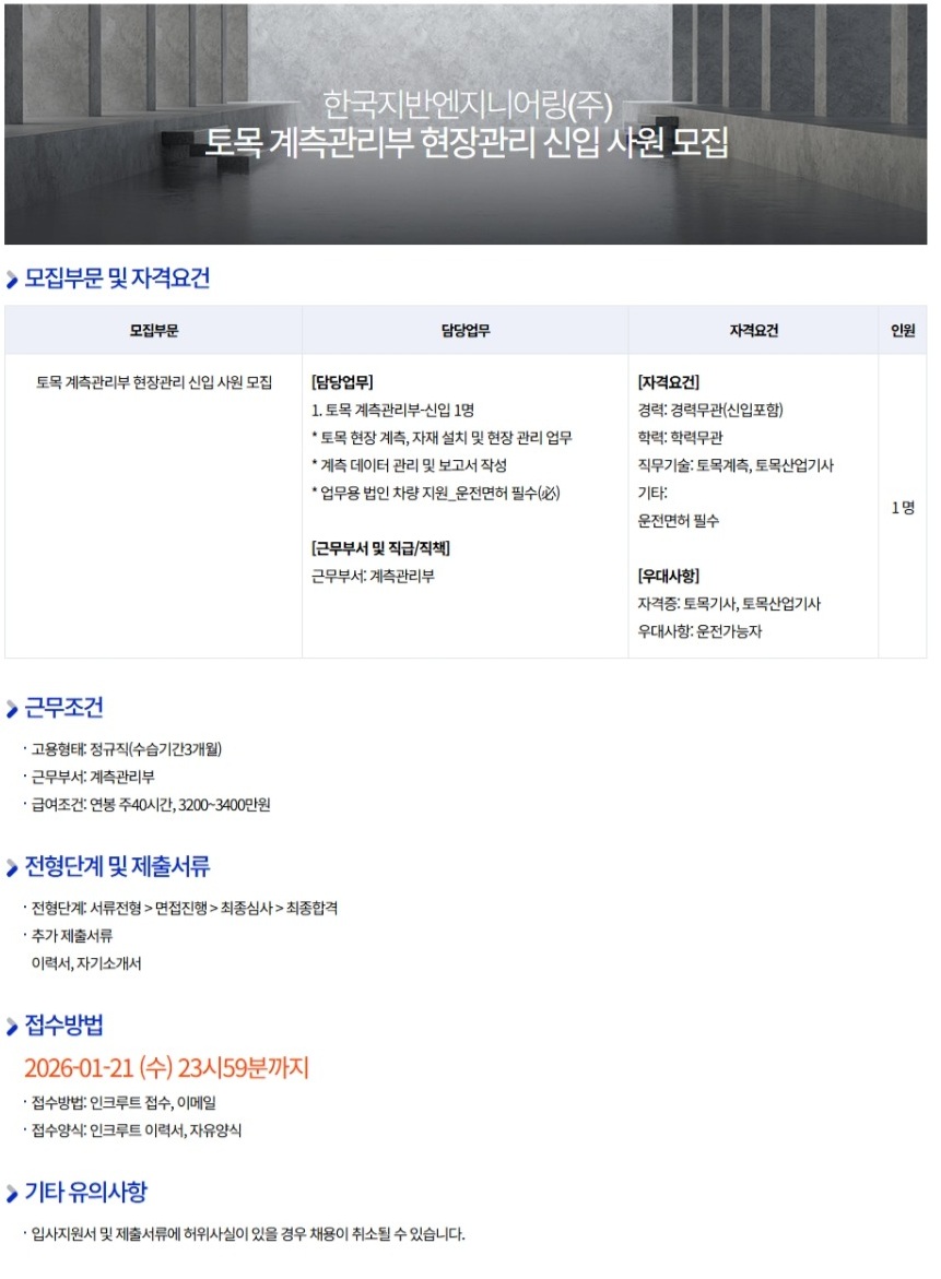[한국지반엔지니어링(주)] 토목계측관리부 현장관리 신입사원 모집공고 (~1/21)